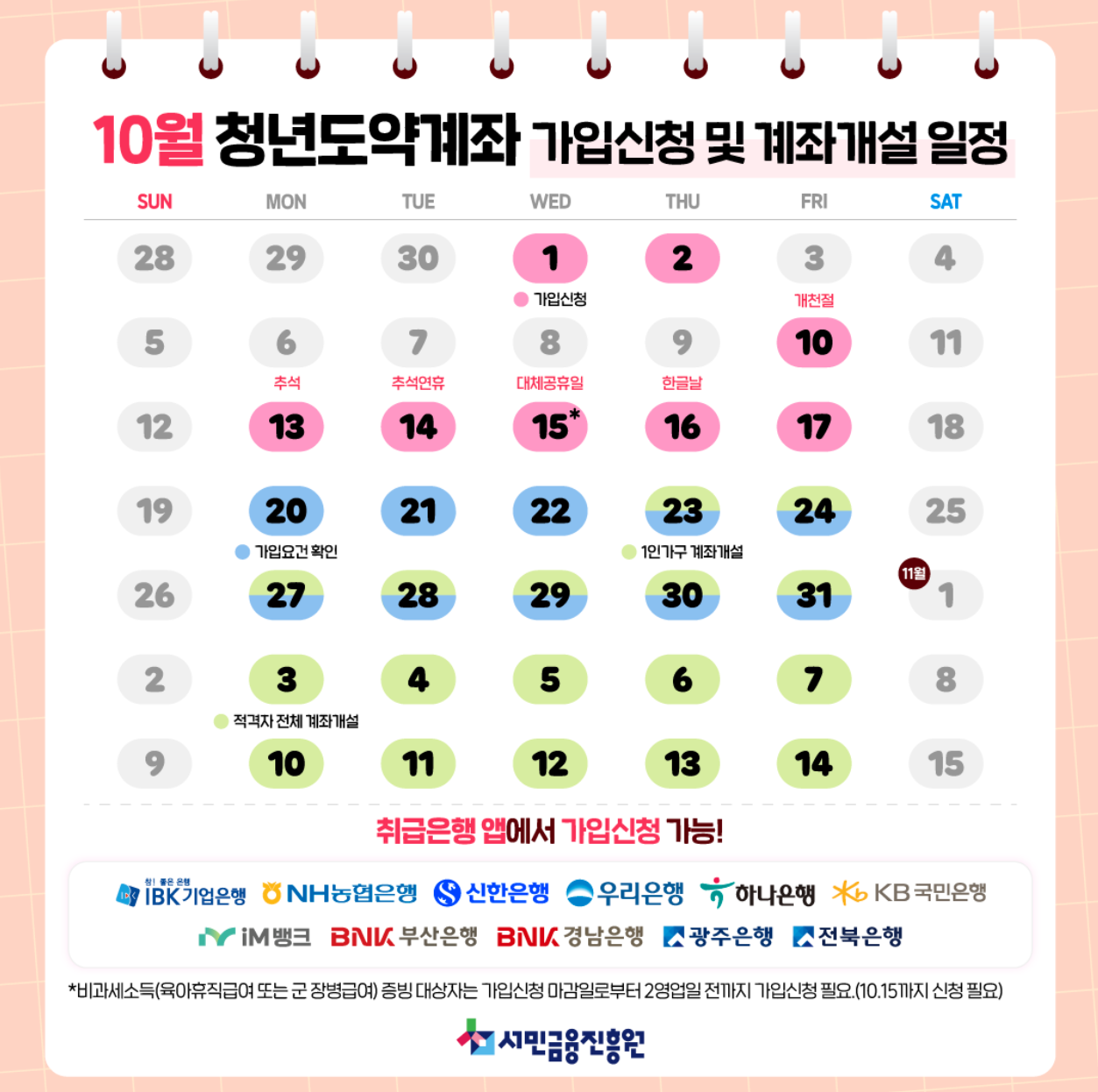 저 역시 청년적금 경험을 통해 꾸준함이 얼마나 큰 자산이 되는지 느꼈습니다. 날짜별로 가입신청 및 계좌개설 일정이 상이하므로 서민금융진흥원에서 청년도약계좌 가입조건을 검색해 보세요. 조건이 맞는다면 늦기 전에 시작하는 게 가장 현명한 선택입니다.